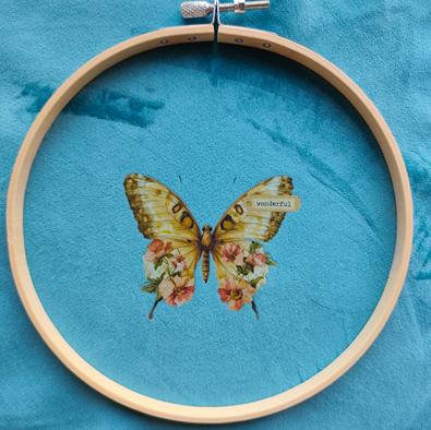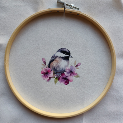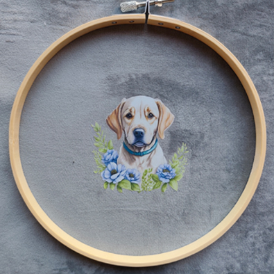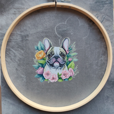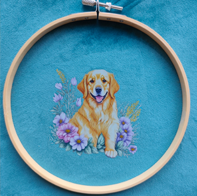 Este kit es para aprender varias técnicas de alta costura y goldwork y hacer diversas flores. En el centro vamos a poner la imagen de una mascota: un perro un gato, una mariposa, un colibrí, una jirafa, koala o caballo, de acuerdo a tu preferencia y el stock.